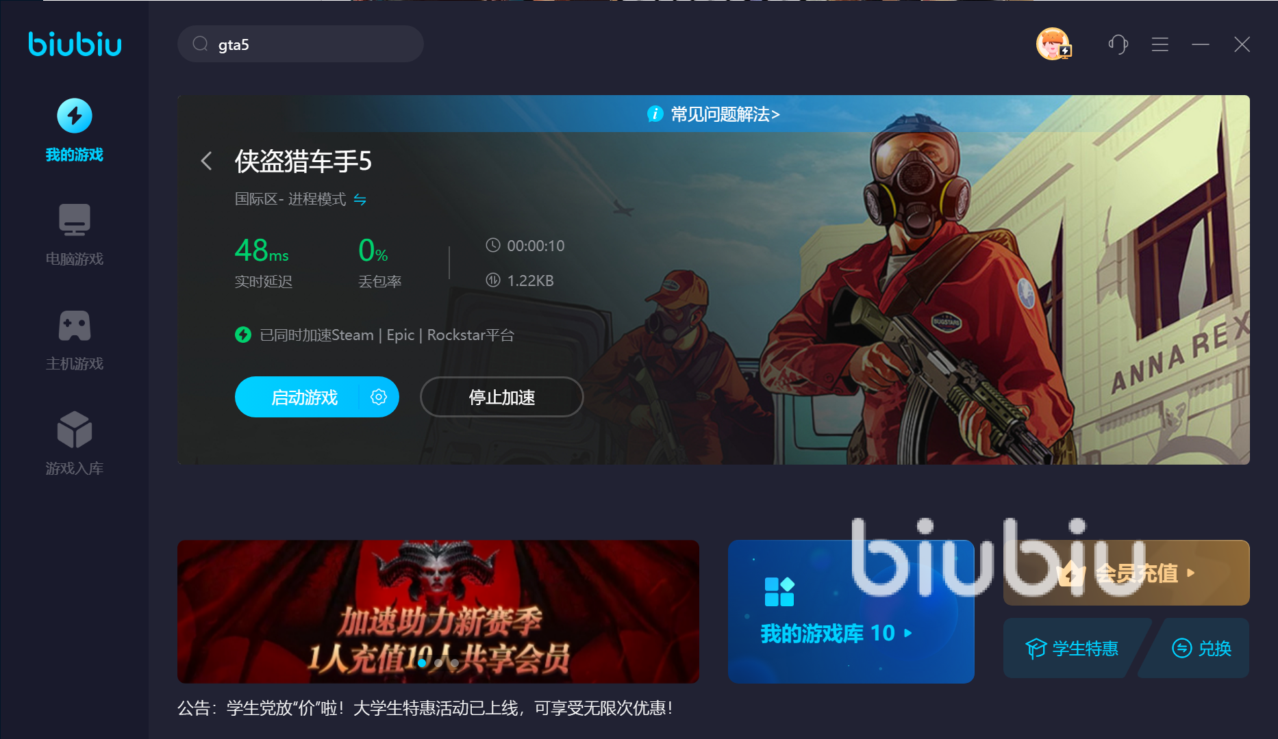 因為gta系列游戲就是相當注重游戲個人體驗的,要是前期階段就想跑跑劇情的話在單機模式下是不用加速器的,但大家想要啟動游戲還是得先有個Steam并能正常打開,所以不管是進行到哪一步都得去搭配到加速器,尤其是當一大戰(zhàn)局里面人數(shù)增多之后對網(wǎng)絡(luò)要求會越來越高,像是高延遲導(dǎo)致的掉線和掉幀問題就出現(xiàn)了,而這個時候要想一次性解決游戲的啟動和聯(lián)網(wǎng)問題的話就用biubiu加速器。
