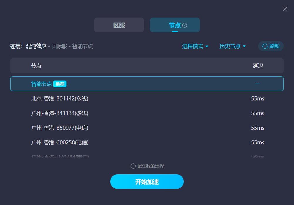 正式加速前,大家還要自己去選擇節(jié)點(diǎn),每一個(gè)節(jié)點(diǎn)的實(shí)時(shí)延遲都會(huì)顯示出來(lái),但有時(shí)候,大部分節(jié)點(diǎn)的延遲都差不多,讓人不知道該選哪個(gè)好,為此,平臺(tái)還設(shè)置了一個(gè)智能節(jié)點(diǎn)功能,啟動(dòng)這個(gè)服務(wù)后,挑選節(jié)點(diǎn)的事情就由系統(tǒng)來(lái)做。