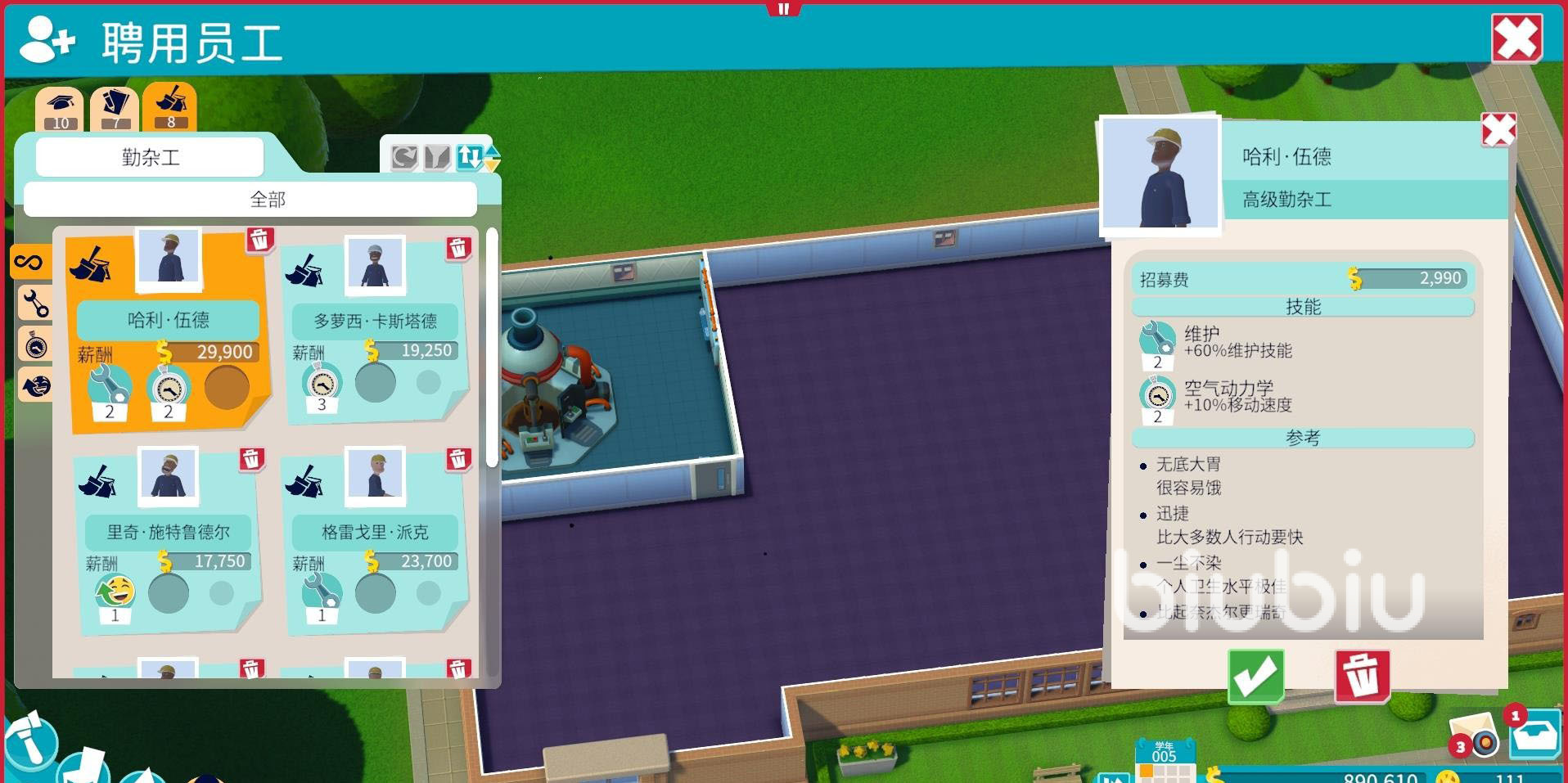 再者,小伙伴們點(diǎn)開上方的第三個(gè)小圖標(biāo),這個(gè)主要就是招勤雜工了,這一類員工干的活就是打掃衛(wèi)生、維護(hù)設(shè)施等了,雖然看起來有些不起眼的樣子,但是想要經(jīng)營好一家學(xué)校,勤雜工也是不能或缺的一部分哦。