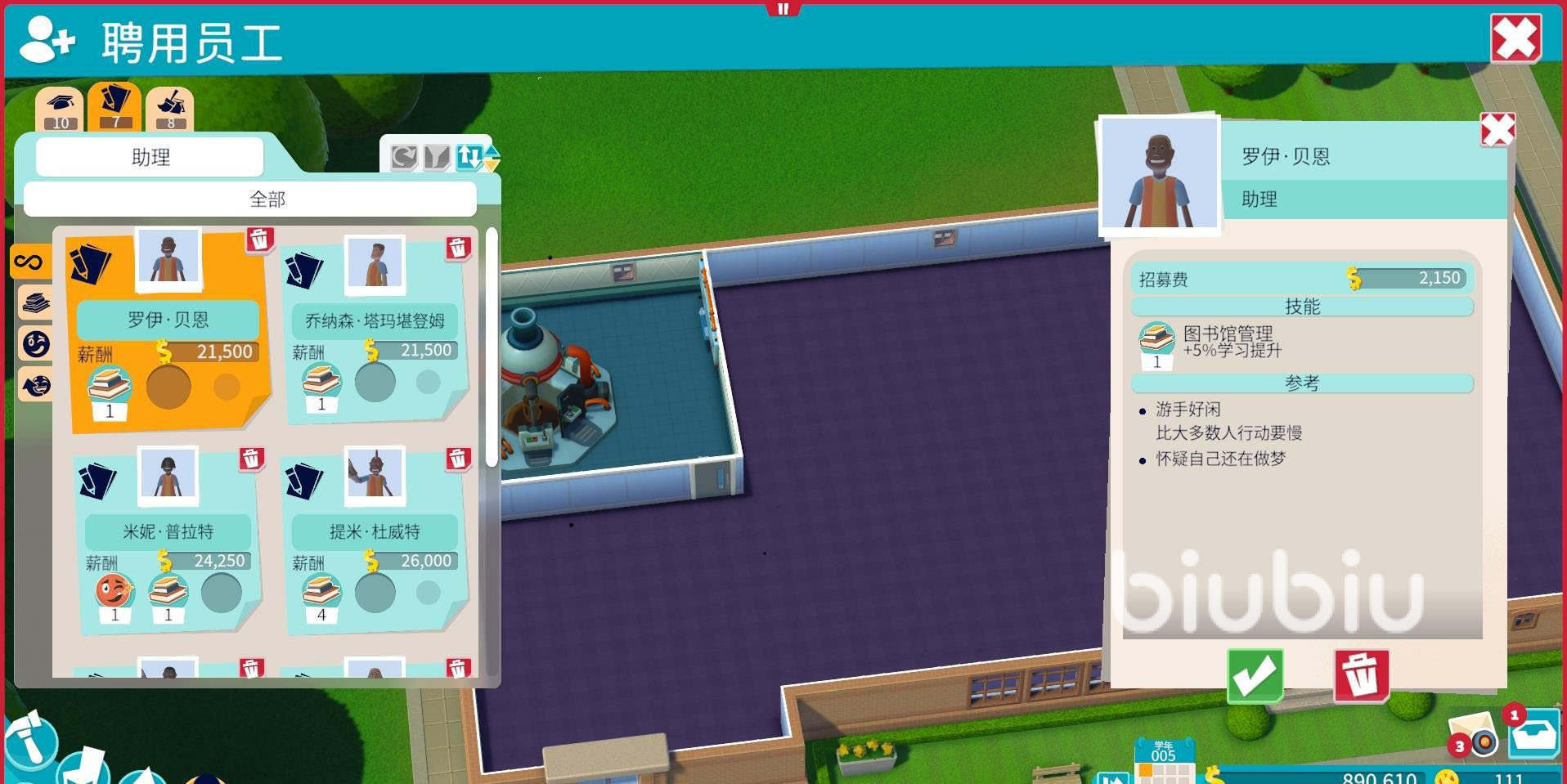 不僅僅是老師,小伙伴們?cè)谡衅附缑?,點(diǎn)其上方的第二個(gè)小圖標(biāo),就能招助理了,而助理的主要用途就在于,造好圖書館或者社團(tuán)以后,都會(huì)需要助理來完成一些工作的,同時(shí)對(duì)于流動(dòng)攤販,助理也是能派上用場的哦。