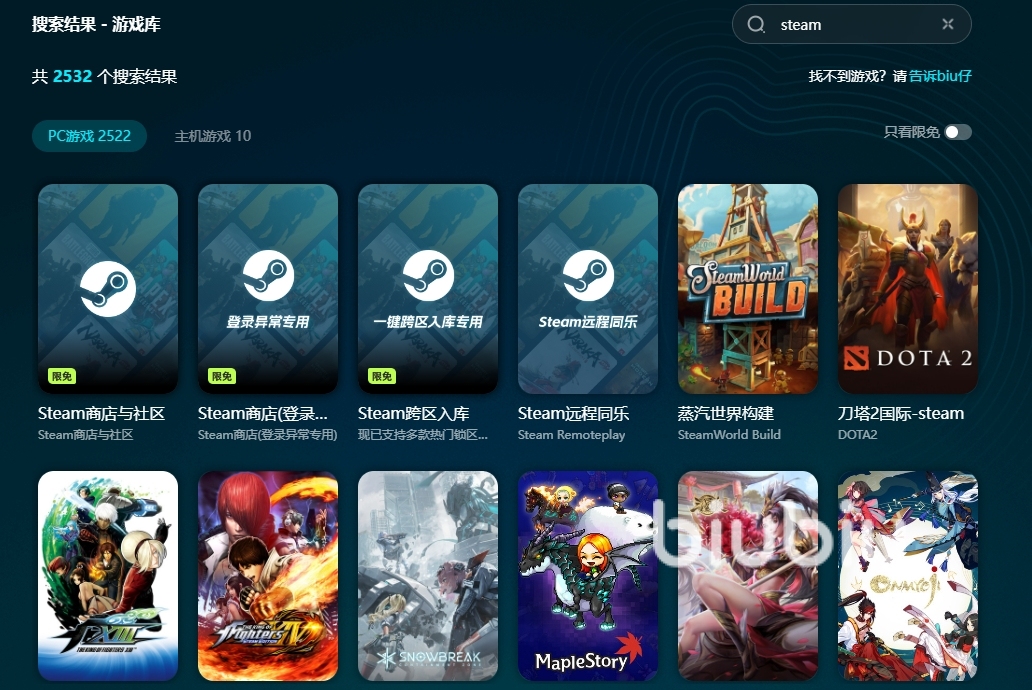 對(duì)于大多數(shù)玩家而言,可能還沒有使用過相關(guān)的加速類工具,因此對(duì)于操作方面可能會(huì)有些困惑,不過不用擔(dān)心,因?yàn)閎iubiu使用起來十分便利,一鍵加速的效果也能讓大家不用擔(dān)心會(huì)有繁瑣步驟,它適用于主機(jī)和PC等各類游戲,部分作品目前更是能享受到限時(shí)免費(fèi)的加速活動(dòng),玩家只需點(diǎn)擊相應(yīng)的游戲即可開啟加速,各位到時(shí)候直接去針對(duì)steam進(jìn)行加速,就可以為它同步開啟加速服務(wù)哦。