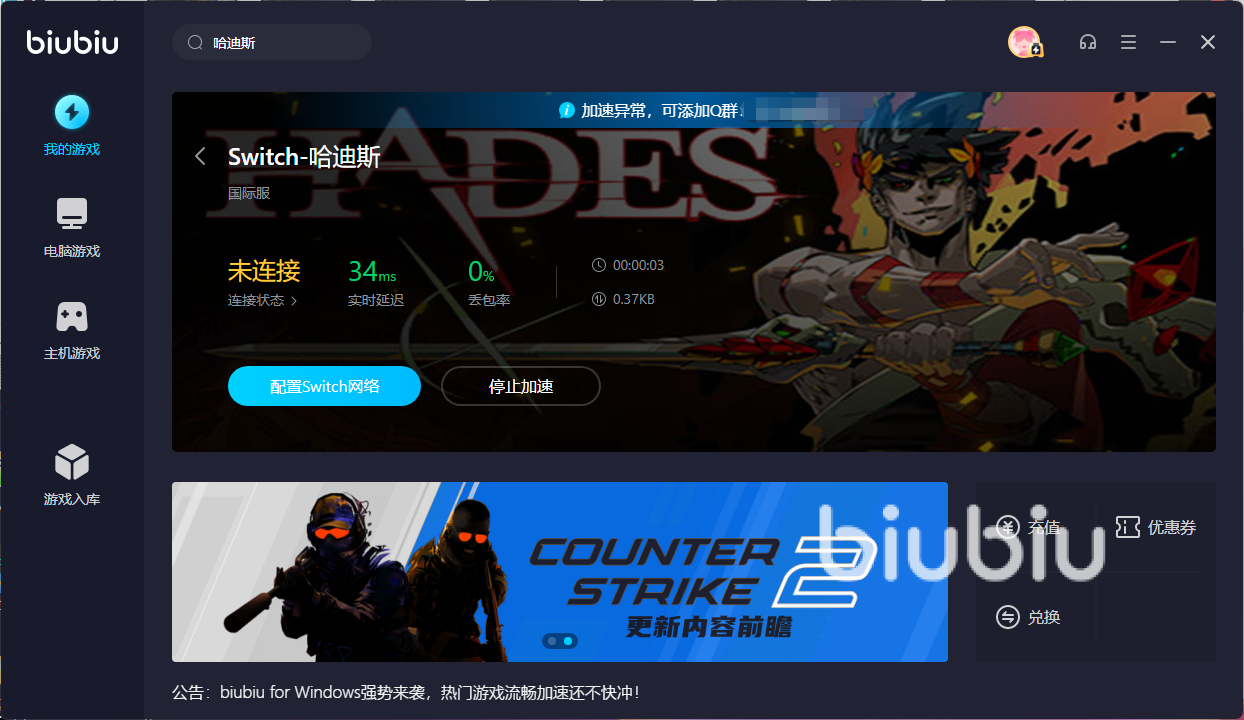 來源: 極光 作者: 七柒叭 2023年04月17日 17:24哈迪斯是一種游戲節(jié)奏很快的動(dòng)作游戲,游戲?qū)⒖旃?jié)奏的玩法和獨(dú)特的手繪美術(shù)畫風(fēng)相結(jié)合,形成了別具一格的游戲風(fēng)格,受到了不少游戲愛好者們的喜愛。但是有時(shí)候小伙伴們玩哈迪斯閃退怎么辦?雖然游戲很有趣,但是任誰也接受不了動(dòng)不動(dòng)就閃退的存在,因此開始有哈迪斯的玩家尋找一款好用的加速器,小編今天就是來給小伙伴們分享一個(gè)好用的加速器——biubiu加速器。