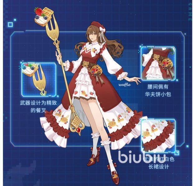 然后角色的設(shè)計(jì)展示如上,可以看到依然保留了王昭君優(yōu)雅的氣質(zhì),同時(shí)在服裝的設(shè)計(jì)上面,也是增加了不少的特點(diǎn),例如武器變成了餐具,而且腰間還有著特殊的華夫餅背包。