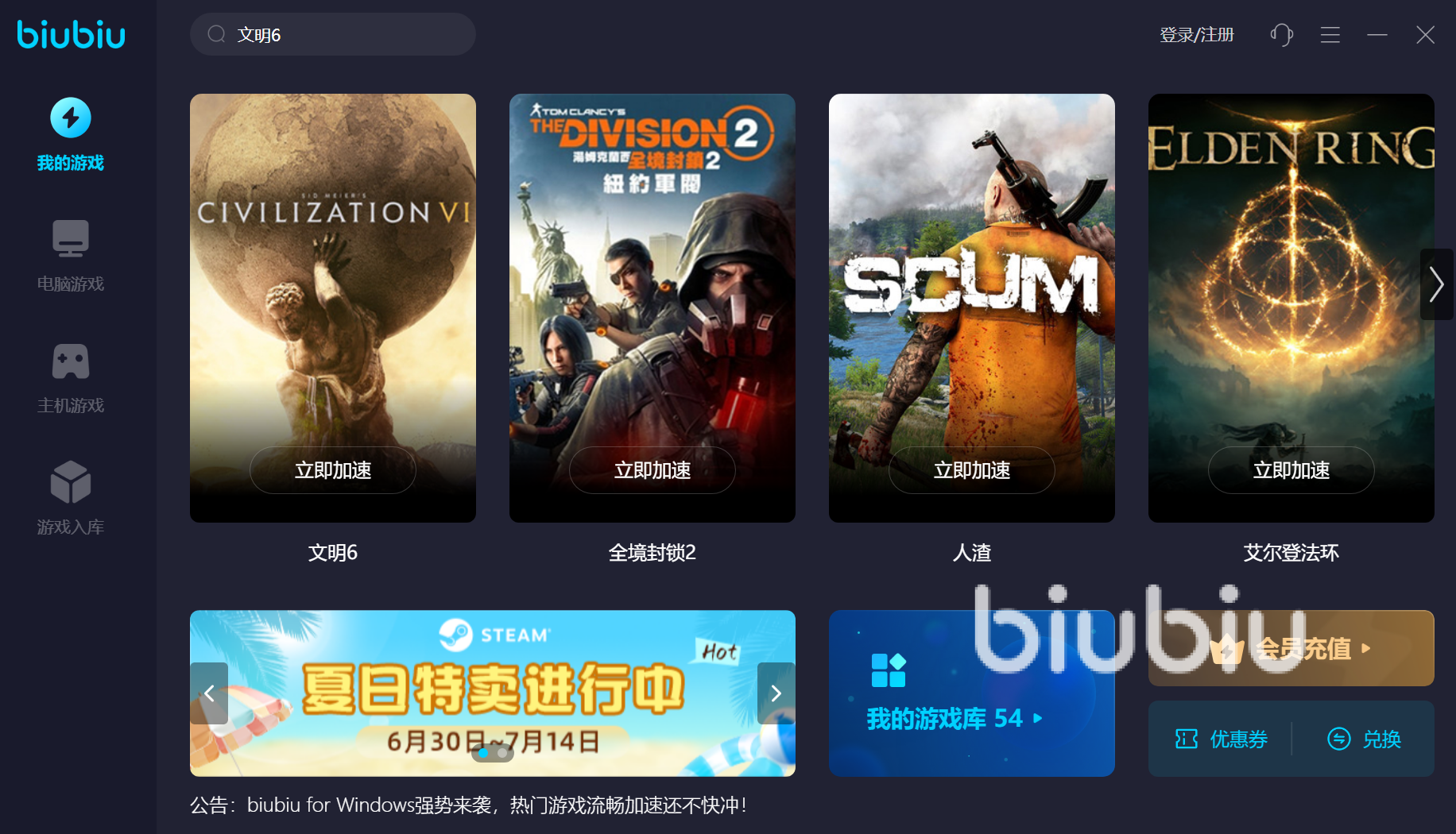 這款加速器可以滿足玩家對(duì)于游戲的各項(xiàng)要求,操作步驟及其簡(jiǎn)單,有過其他加速器使用經(jīng)驗(yàn)的伙伴會(huì)吐槽,找不到摁鍵或者是使用不是那么的順手,但是biubiu加速器完全不會(huì),只要按照小編給的鏈接點(diǎn)擊下載安裝,登錄注冊(cè)進(jìn)到主頁,就可以直接搜索文明6游戲,接下來你會(huì)看到跟上圖雷同的畫面,根據(jù)你的需要直接選擇就好了,標(biāo)識(shí)限免標(biāo)簽的就是支持免費(fèi)加速,不過是有時(shí)間限制的,對(duì)于沒有使用過的玩家來說是非常不錯(cuò)的體驗(yàn)。