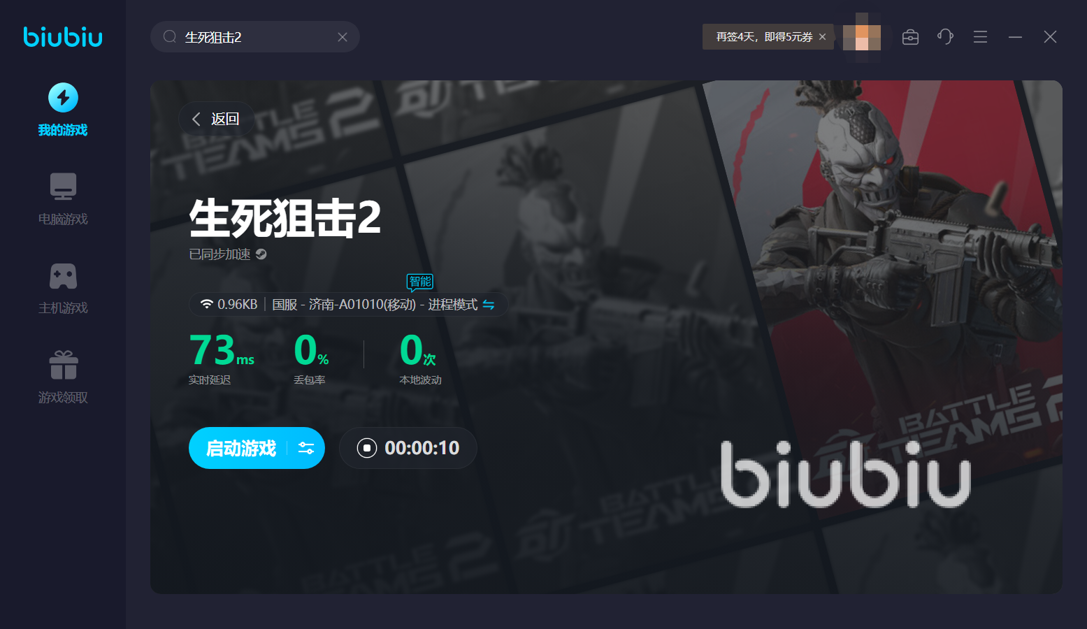 來源: 極光 作者: 大王 2024年04月15日 15:18不少游戲愛好者很早就入坑了生死狙擊2這款游戲了,相對于前作來說有了很大的改變與改進,所以就又吸引了一大部分忠實的粉絲,然而,想知道生死狙擊2掉線頻繁怎么辦還需要大家認真閱讀下面小編的介紹內容,幫助大家很好的解決各種網(wǎng)絡現(xiàn)象的存在,有了biubiu加速器之后這些現(xiàn)象會減少出現(xiàn)的次數(shù),給予大家更為流暢且高效的游戲體驗,根據(jù)小編的推薦去下載這款加速器準沒錯。