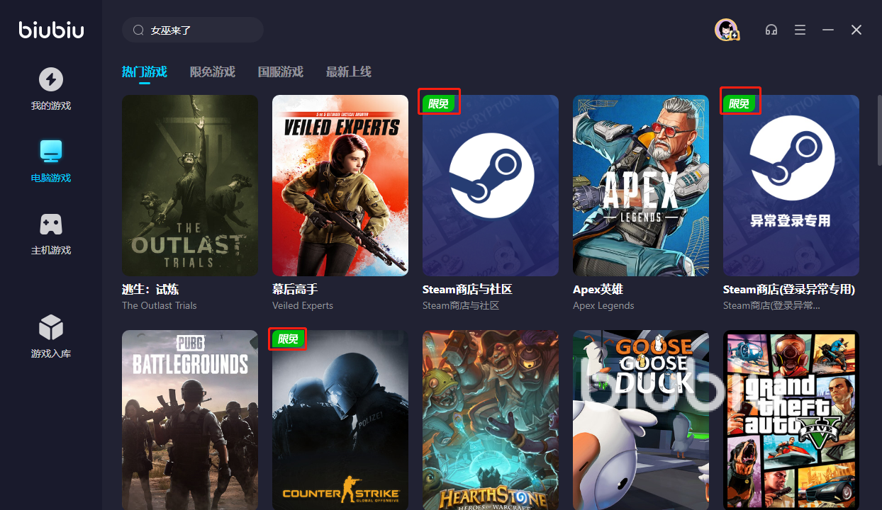 在了解加速器的功能如此強(qiáng)大之后,玩家們也會習(xí)慣性地再去找更多的游戲玩,而鎖定的目標(biāo)通常就放在人氣較高的游戲以及剛剛上線沒多久的游戲,但卻又擔(dān)心新上線游戲沒有加速服務(wù),而這個問題在“電腦游戲”分區(qū)內(nèi)就能看到,這里都是根據(jù)數(shù)據(jù)統(tǒng)計出來的新游戲和熱門游戲,只要是有的話就代表同樣也能加速,同時還能注意到下方的“主機(jī)游戲”中都是限免活動中。