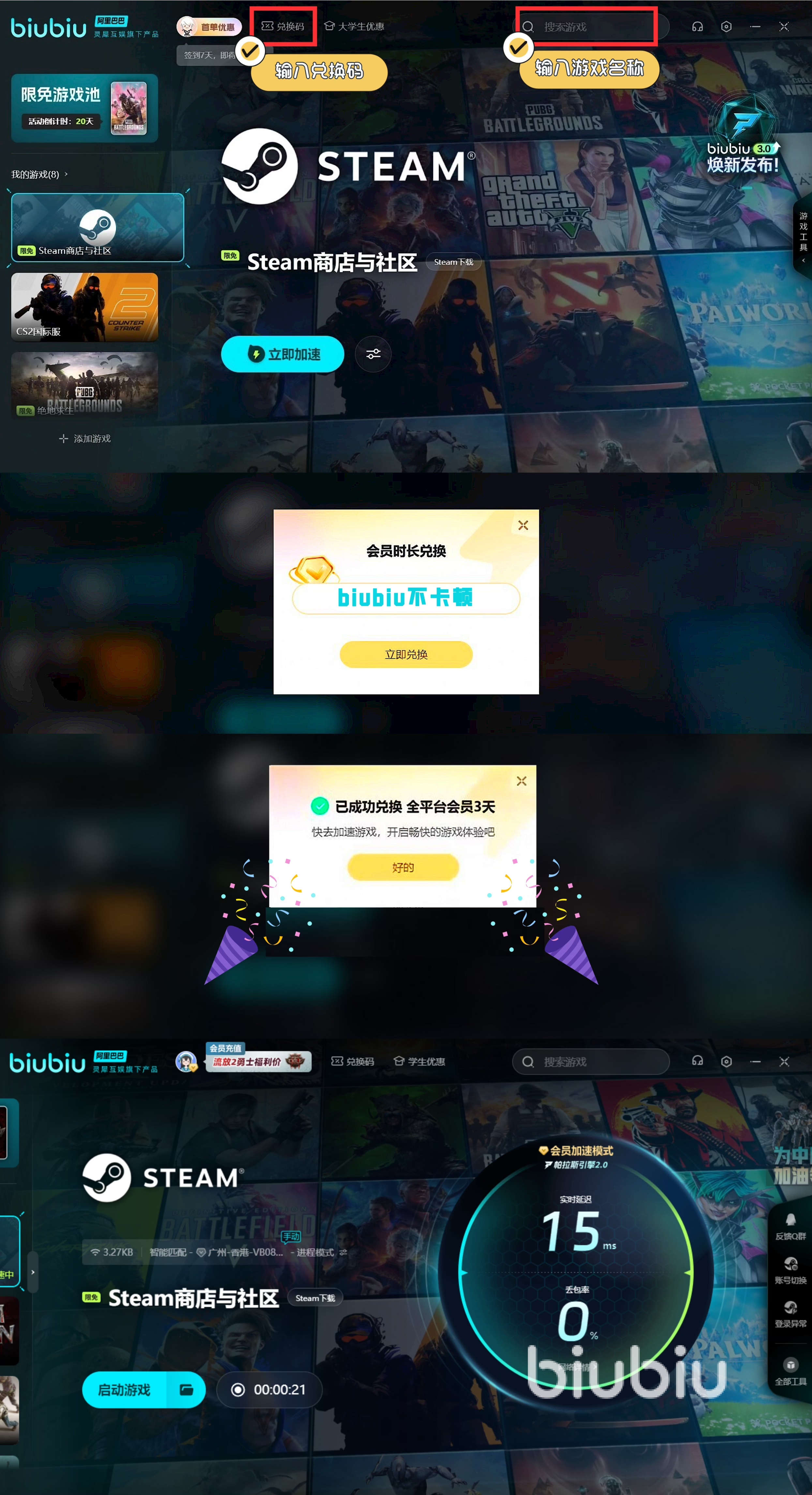 不過就算再好用的角色,網(wǎng)太卡也不能解決對手??梢韵扔胋iubiu,就能為steam提速,讓你更快解決對手。新用戶的話可領(lǐng)取3小時的免費加速,另外新老用戶采用【biubiu不卡頓】,又能額外暢享三天免費加速。