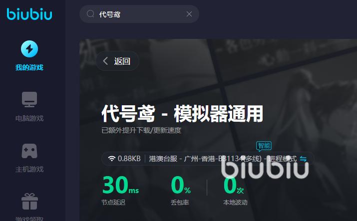 biubiu對于代號鳶模擬器也是提供加速服務(wù)的,只要通過名稱查找,就可以在客戶端快速的找到加速方式,整個操作都很便捷,兩秒鐘就可以完成了。如果還有其他喜歡的游戲,也可以在這里進(jìn)行搜索哦,biubiu的游戲庫很龐大,同樣可以得到加速服務(wù)的。