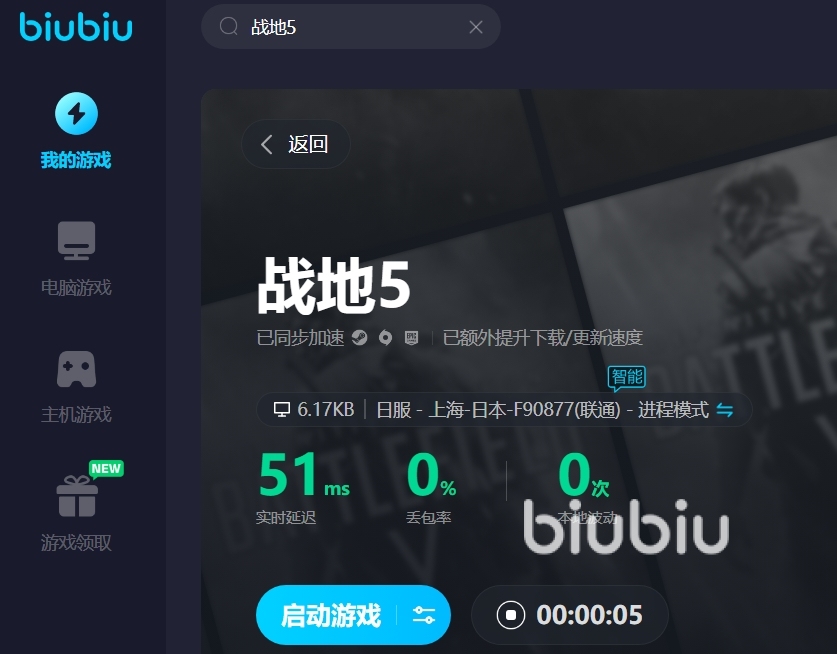 上述就是戰(zhàn)地5開槍閃退怎么辦的解決方式的分享。通過steam端來啟動的游戲內(nèi)容是越來越豐富了,而且這些游戲的內(nèi)容也都很有挑戰(zhàn)性。不過就是在啟動時會需要利用加速器的加速模式來幫忙登錄游戲或者是穩(wěn)定游戲過程中的網(wǎng)速,那么BIUBIU作為其中一款熱門加速器在加速支持的效果上還是很不錯的。