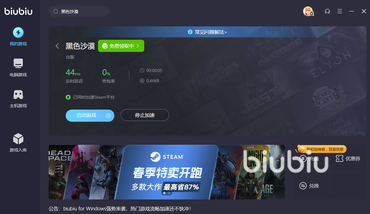 其實(shí)加速器的使用非常一點(diǎn)都不難,還沒有下載伙伴可以根據(jù)小編提供的鏈接完成安裝注冊(cè),登錄界面成功了之后就可以在左側(cè)選擇游戲,搜索欄目中輸入黑色沙漠游戲名稱,然后不要急著做下一步的操作,先把手機(jī)跟pc端的steam平臺(tái)退出來(lái),然后再到加速器里邊點(diǎn)擊加速,最后直接登錄steam就可以繼續(xù)后邊的操作了領(lǐng)取該游戲了。