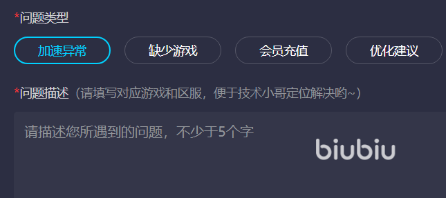 一些玩家在使用過程中會發(fā)現(xiàn)平臺上各種問題,這也是有可能的,不管是游戲上的,還是加速上的,就可以直接向右上角進行問題反饋了,問題肯定是要早一點處理的,這樣的話大家日后就少一點麻煩了?,F(xiàn)在游戲內(nèi)容其實很多,但也不排除一些冷門游戲,到時候找biu仔進行反饋一下,等待及時的更新。小伙伴們現(xiàn)在對于活動上的需求,應該是關注新用戶注冊免費使用加速24小時,以及早早就給大家體驗上的限免游戲,都是相當給力的,想要了解第一手信息的那就在主頁查看吧。