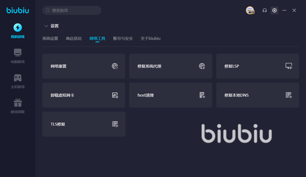 為了全方位解決網(wǎng)絡(luò)方面問題,也為了提高加速效果,biubiu還提供了很多網(wǎng)絡(luò)方面的工具,大家在主頁面中找到設(shè)置選項,點擊之后就可以查看很多相應(yīng)的小工具。根據(jù)遇到的不同問題去選擇,如果大家遇到加速失敗或者是加速效果不佳,可以嘗試使用修復(fù)代理系統(tǒng)解決,如果遇到的是加速頁面異常,可以選擇修復(fù)本地dns等。如果大家使用的是各種平臺登錄游戲,例如steam等,也可以在商店優(yōu)化中選擇針對這些平臺所提供的修復(fù)措施來解決遇到的各種異常問題。這樣即使是小白用戶,也可以瞬間化身為網(wǎng)絡(luò)高手。