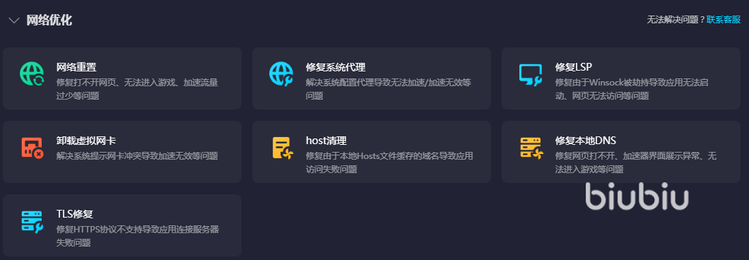 除了游戲加速外,它也有其他小工具幫助大家優(yōu)化網(wǎng)絡(luò)。在工具箱里有不同的優(yōu)化功能,既能重置電腦虛擬網(wǎng)卡,又可以清理緩存,幫助游戲運(yùn)行更加流暢。如果這些小工具還不能夠解決問題,大家也可以聯(lián)系客服咨詢解決的辦法,或者到官網(wǎng)看看有沒有相關(guān)教程學(xué)習(xí)。