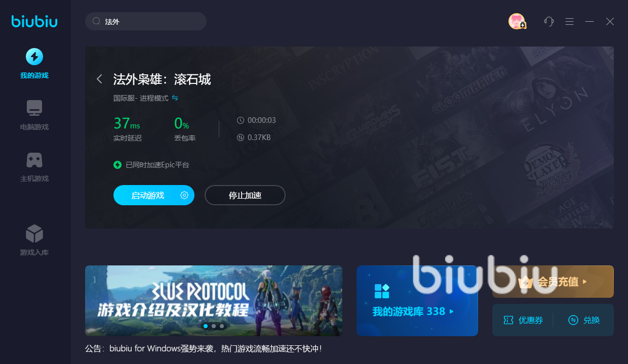 來源: 極光 作者: 果果 2023年06月13日 15:14游戲采用的是第一人稱的射擊玩法,小伙伴們可以穿梭在城市之中,體驗各種刺激的對決,同時游戲的劇情也是相當(dāng)豐富的,今天小編就來和大家介紹下法外梟雄滾石城卡頓怎么辦,如果說小伙伴們在游戲體驗時遇到了此類現(xiàn)象,那么大概率都是網(wǎng)絡(luò)延遲或者是卡頓導(dǎo)致的,而想要解決這個問題其實也很簡單,那就是使用biubiu加速器就可以輕松的完成,并且在游戲運行以后,能夠享受更加穩(wěn)定且暢快地游戲體驗。