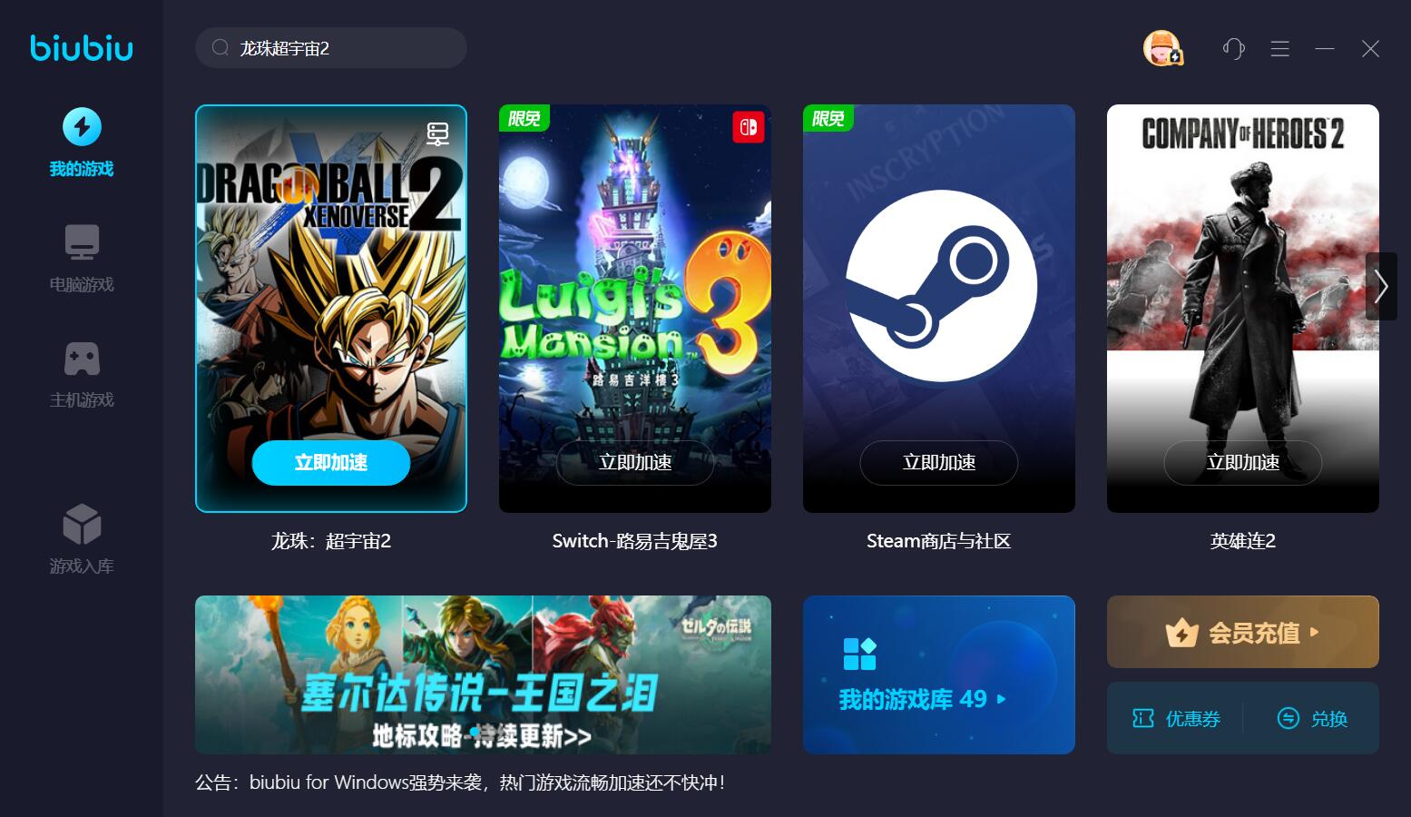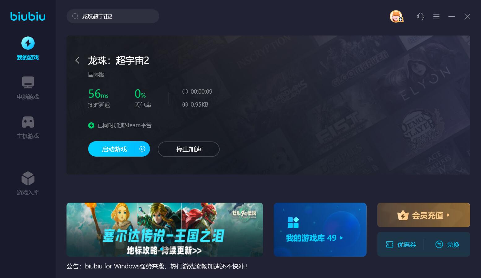 如果游戲無法啟動,大概率是網(wǎng)絡不夠穩(wěn)定,這時,使用專業(yè)的軟件,去給自家的網(wǎng)絡進行優(yōu)化,降低丟包率和延遲,就會產(chǎn)生一定的效果。使用biubiu加速器的方法也不難,大家只要打開這個產(chǎn)品,運用檢索功能,定位到對應的游戲加速入口,并將其添加到主界面,接著點擊立即加速,再去運行游戲,就可以順利打開了。