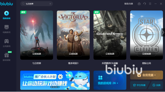 如今新用戶(hù)一共可享受96小時(shí)的免費(fèi)加速時(shí)長(zhǎng),其中一種方法只需玩家注冊(cè)登錄以后就可以直接享受免費(fèi)加速24小時(shí),另一種就是兌換碼福利一共可免費(fèi)加速三天,方法就是輸入兌換碼【biubiu不卡頓】,兌換碼福利是不分新老用戶(hù)的。