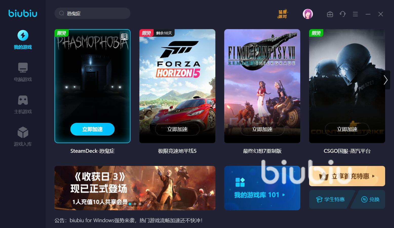 正是這種特別的游戲性質(zhì),讓很多玩家選擇聯(lián)網(wǎng)去體驗,但在聯(lián)機探索期間,有些用戶反饋,經(jīng)常無法啟動聯(lián)機模式。發(fā)生這種情況,很有可能是網(wǎng)絡不穩(wěn)定引起的,用戶可以使用biubiu加速器,去對自用的網(wǎng)絡進行優(yōu)化處理,當網(wǎng)絡波動變小了,再去玩聯(lián)機模式。具體的操作方法也不難,玩家打開軟件后,搜索到恐鬼癥的加速入口,并點擊圖標上面的立即加速后,加速服務就開始了。為了回饋用戶,平臺推出了新用戶注冊免費使用加速24小時的福利。