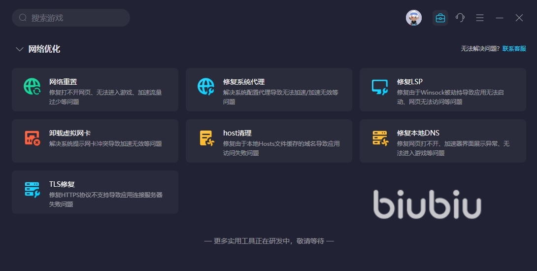 有時候一些網(wǎng)絡問題是很難找到原因的,總是網(wǎng)關丟失,不知道怎么設置那就可以直接使用biubiu的百寶箱功能,里面有多個修復選項,每個都試一遍總能將問題解決的。