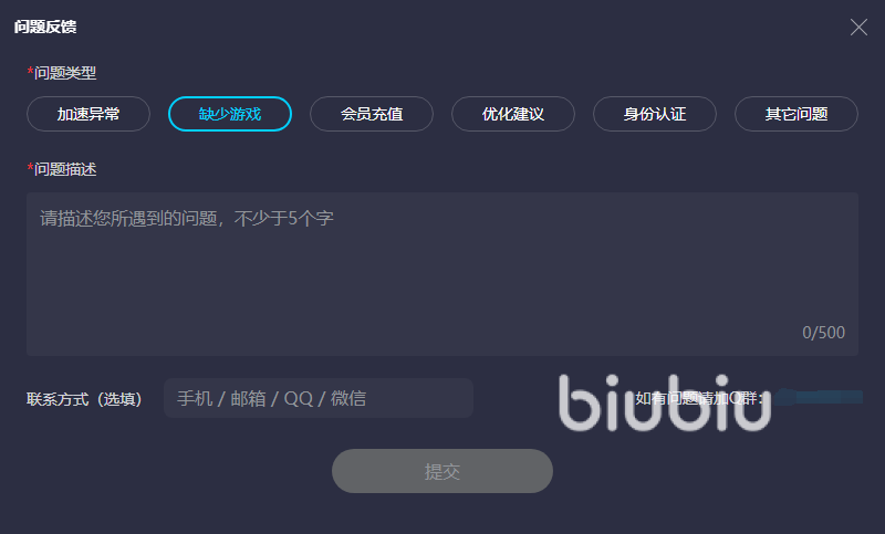 當(dāng)然了,每一個(gè)玩家因?yàn)槭褂们闆r的不同,難免也會(huì)遇到各種各樣的問(wèn)題,而平臺(tái)的反饋機(jī)制則會(huì)起到重要作用。大家隨時(shí)可以反饋遇到的各種情況,甚至可以將游戲庫(kù)當(dāng)中沒(méi)有的游戲進(jìn)行提交,隨后平臺(tái)則會(huì)為大家進(jìn)行處理。相反,市面上很多小型加速平臺(tái)支持的游戲數(shù)量少,更沒(méi)有辦法通過(guò)反饋的方式來(lái)增加游戲作品。