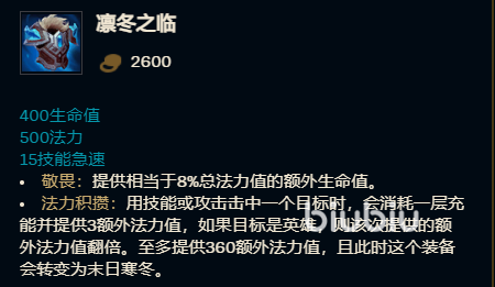 傳統(tǒng)的流浪都是選擇大天使,大天使加法力值加法術(shù)強(qiáng)度的屬性固然可觀,但是這樣流浪的容錯(cuò)率的更低。所以不如另辟蹊徑,選擇出另一件法力值裝備-凜冬之臨,提供高額的基礎(chǔ)生命值和法力值屬性,對(duì)拼的時(shí)候還會(huì)獲得額外的法力值加成,這樣額外的法力值的配合流浪的被動(dòng)還可以造成額外傷害。當(dāng)然凜冬之臨最特殊的被動(dòng)還是敬畏-提供總法力值百分比的額外生命值,利用這個(gè)被動(dòng)流浪可以選擇更多的法力值裝備變得更肉,在陣容中就可以承擔(dān)更多的作用。當(dāng)然對(duì)于凜冬之臨流浪的輸出玩家也不用擔(dān)心,流浪越到后期越厲害,而且站得住就會(huì)有更多的輸出。