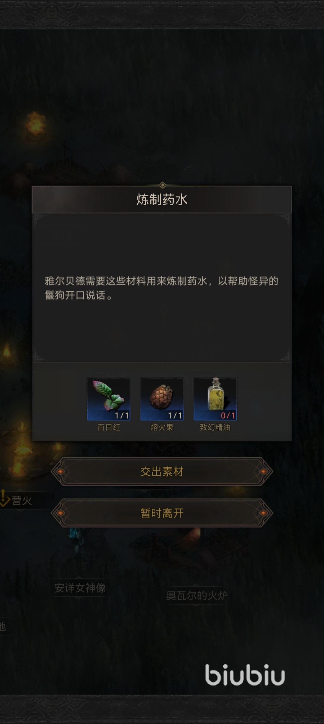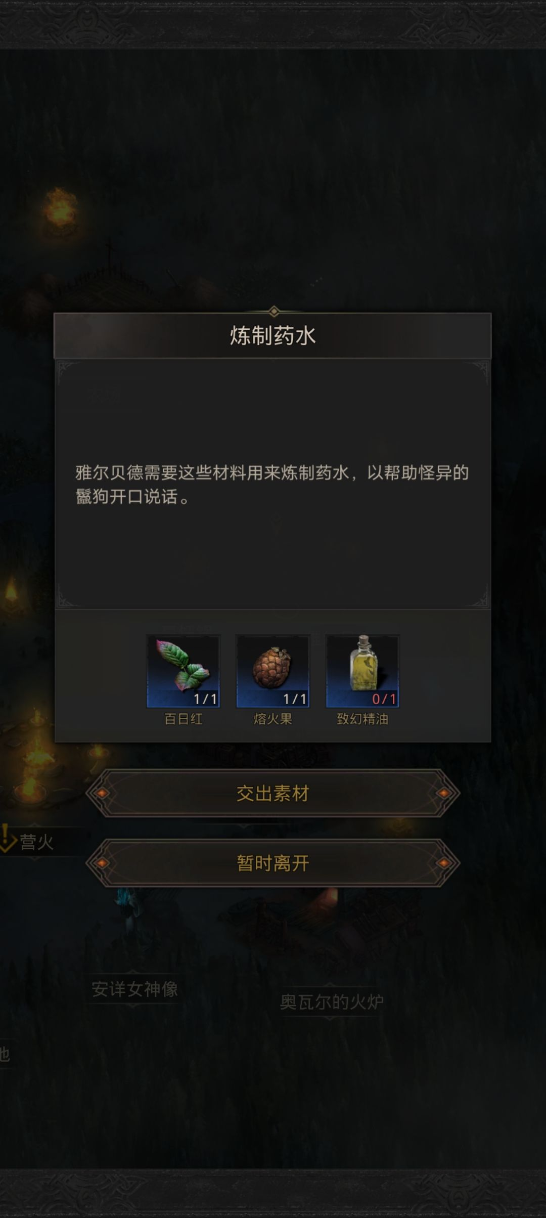 2、此時先回家和貓咪雅爾貝德進行對話,貓咪會給出3種材料讓玩家去尋找。貓咪所問的問題直接選擇王室即可,收集好所有材料后回家找貓咪就能煉制藥水了。