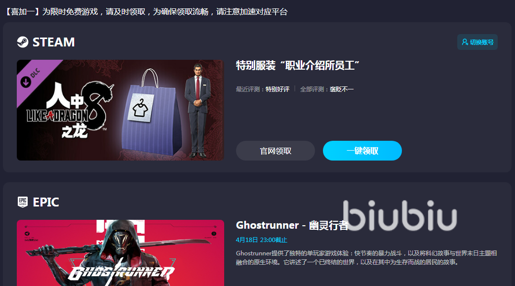 小編知道大家不會只盯著一款游戲玩,正好現(xiàn)在biubiu給大家贈送了免費的游戲,趕緊到游戲領取里面看一看。免費領取的都是一些渠道游戲,比如steam游戲或者EA游戲,資源不定期更新,每一期帶來的驚喜都不一樣,看到喜歡的游戲只要跟著系統(tǒng)指引的步驟領取就可以了。