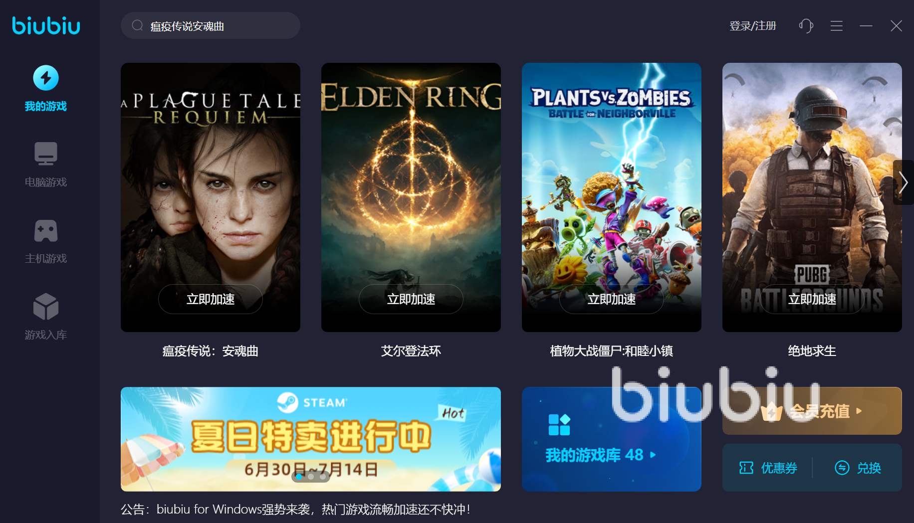 另外biubiu平臺(tái)為大家推出了限免的游戲?qū)^(qū),每天都會(huì)更新不同的熱門游戲加入到這個(gè)專區(qū)里邊,所以大家有任何想玩的游戲可以在這里隨意的搜索。對(duì)于平時(shí)不怎么玩游戲的玩家來(lái)說(shuō)總有那么幾款限免游戲是你最喜歡的,同時(shí)也不需要你購(gòu)買額外的加速時(shí)長(zhǎng),可以說(shuō)非常的劃算了。