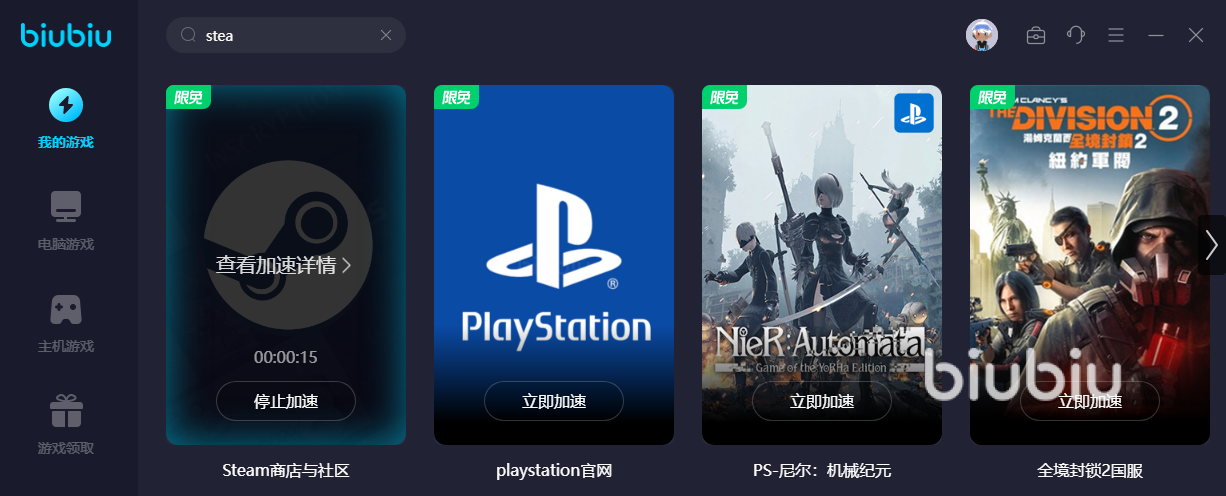 而biubiu的功能界面也是清晰明了的,只要用過(guò)加速服務(wù)的選項(xiàng),都會(huì)在我的游戲里面進(jìn)行展示。除了直接使用Steam,很多游戲都可以找到對(duì)應(yīng)的單獨(dú)加速路徑,選擇還是非常多樣的,多方位滿(mǎn)足大家的各種需求,點(diǎn)個(gè)贊。