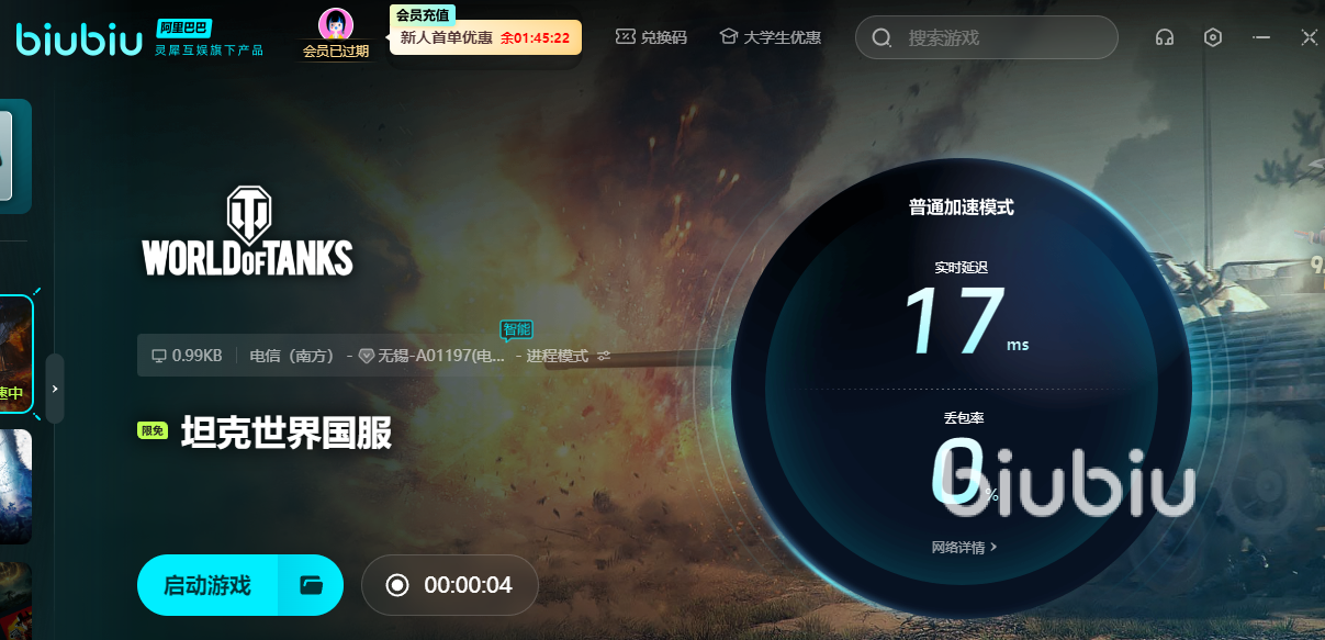 各位現(xiàn)在可以去注冊一個新賬號,然后跟著小編的步驟來,先是登錄賬號,新人直接就可以領(lǐng)到大禮包,里面有24小時的免費使用時間的,然后還有個兌換活動大家是都能夠參與的,拿到免費的加速時間是72小時哦,新老用戶用【biubiu不卡頓】去兌換就可以得到了。這樣算一下,是不是新用戶足足可以使用96小時加速時間呢。