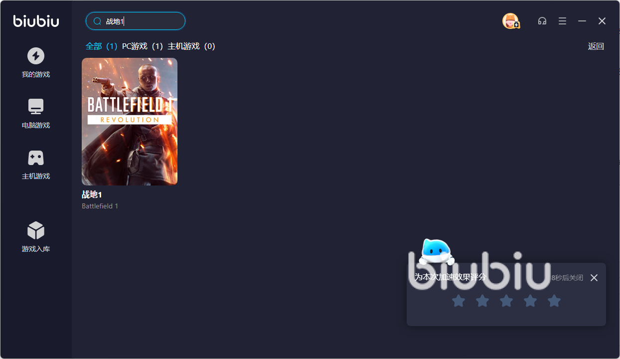 進(jìn)入biubiu的界面后,在搜索欄中搜索戰(zhàn)地5,即可讓戰(zhàn)地5出現(xiàn)在我們的加速界面中,點(diǎn)擊添加,讓戰(zhàn)地5一鍵入庫(kù),biubiu加速器就會(huì)在后臺(tái)自動(dòng)下載戰(zhàn)地5的加速支持系統(tǒng),全程僅需不到一秒鐘哦!