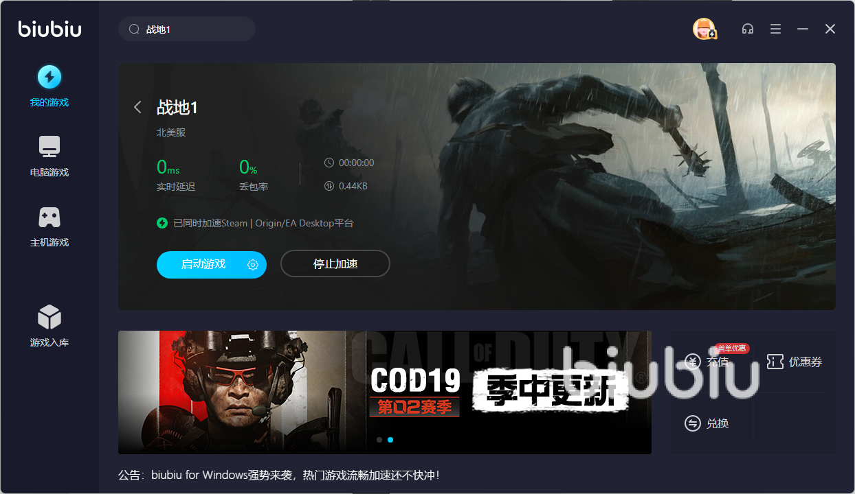 小編在使用了biubiu加速器后,在美服玩的那可叫一個(gè)流暢呀!biubiu加速器作為搭載了全網(wǎng)最先進(jìn)的雙線加速技術(shù)的優(yōu)秀加速器,因?yàn)槭褂昧穗p線加速技術(shù)的緣故,相比于其他的加速器,biubiu加速器在穩(wěn)定高效這一最基本的功能上可謂是遙遙領(lǐng)先于其它的加速器同行!使用biubiu加速器進(jìn)行游戲加速,一定能保證游戲全程無(wú)卡頓,低延遲!小編在使用了biubiu加速器后,可就再也舍不得它啦!接下來(lái)由小編來(lái)為大家介紹biubiu加速器加速戰(zhàn)地5的方法把~