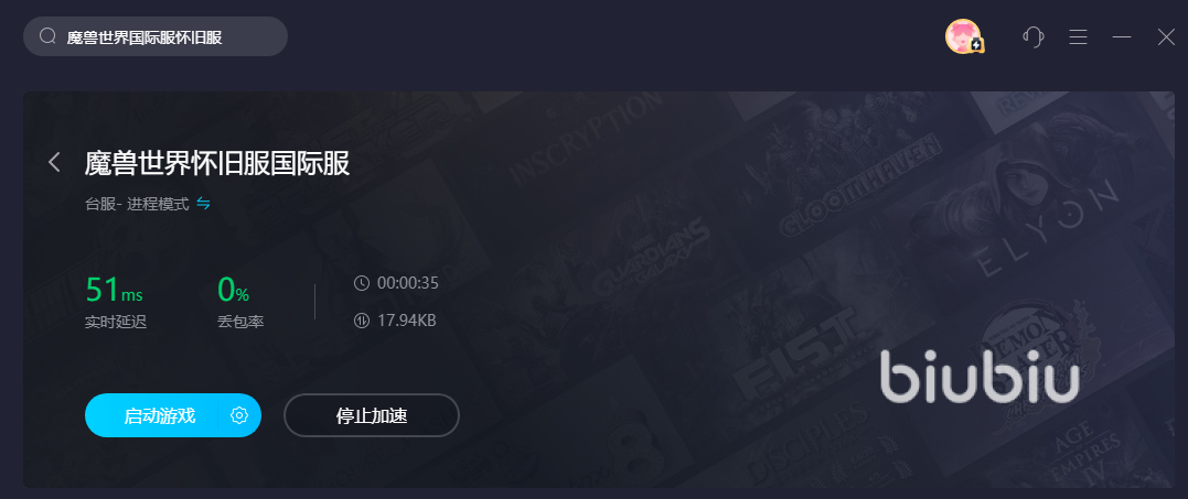 看到這里相信大家也明白了今天這一篇文章的意義了,沒(méi)錯(cuò),為的就是能讓更多的魔獸玩家能夠暢玩懷舊服國(guó)際服。那么這一點(diǎn)該如何做到呢?首先要做的肯定是幫助大家解決網(wǎng)絡(luò)問(wèn)題,使用游戲加速器是解決玩國(guó)際服網(wǎng)絡(luò)延遲的一種辦法,這里小編向大家推薦biubiu加速器。