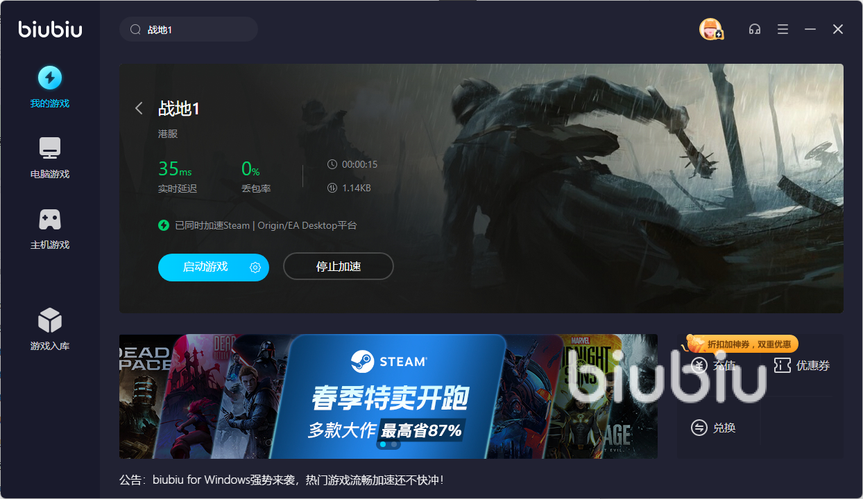 1.?我們先打開瀏覽器,搜索biubiu加速器,找到官方網(wǎng)站,下載完Windows版本的安裝包之后,按照引導(dǎo)安裝完成之后打開客戶端。登錄完成之后,購買加速給我們推薦的套餐,然后我們再進(jìn)入搜索欄搜索戰(zhàn)地1。