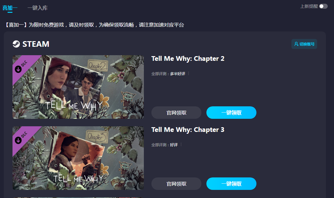 英雄聯(lián)盟玩多了,偶爾也要換換口味,大家可以在biubiu里領(lǐng)到免費(fèi)的steam游戲,平臺(tái)手把手教大家如何領(lǐng)取,里面還有很多支持一鍵入庫的游戲點(diǎn)擊就能領(lǐng)取,方便大家直接使用biubiu來加速。感興趣的小伙伴記得打開上新提醒,這樣就不會(huì)錯(cuò)過每期贈(zèng)送的游戲了。