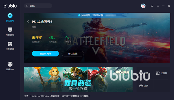 Biubiu作為國內(nèi)頂尖的游戲加速產(chǎn)品,其支持的作品是非常多的。大家能夠叫上名字的帶有線上要素的游戲基本都是可以找到,打開軟件之后我們可以點(diǎn)擊左側(cè)的游戲分類進(jìn)入到相應(yīng)的專區(qū)查看,也能夠通過搜索來快速檢索定位。而且這款加速器不僅是支持PC游戲的加速,有一些登陸主機(jī)平臺的作品也是可以使用的,比如說戰(zhàn)地5這款游戲,除了可以加速PC版之外,Xbox和PS版都是能夠獲得一定的網(wǎng)絡(luò)優(yōu)化以及提升。