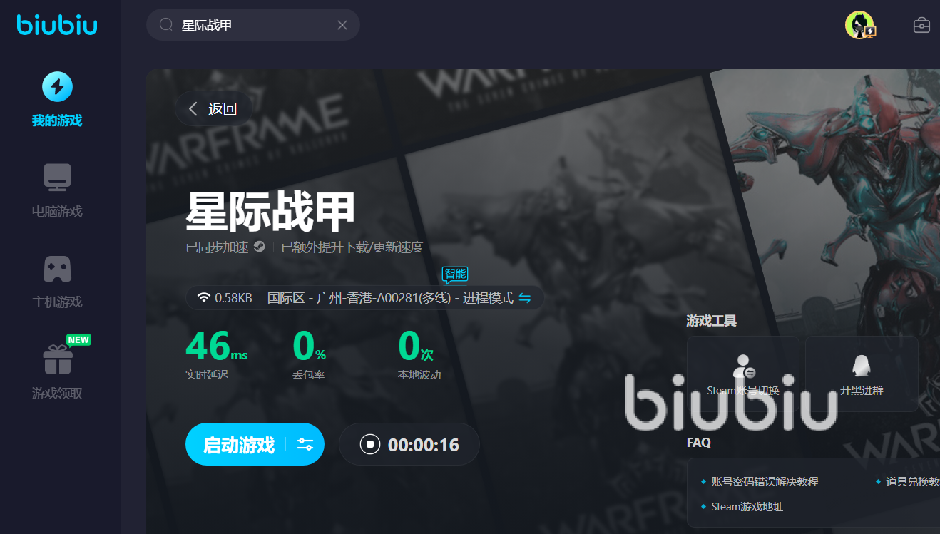 星際戰(zhàn)甲是Biubiu可以加速的游戲之一,在加速星際戰(zhàn)甲的網(wǎng)絡(luò)的時(shí)候,如果自己電腦上有這款游戲的話,在biubiu可以自動(dòng)檢測(cè)出游戲,用戶點(diǎn)擊加速按鈕就可以開啟網(wǎng)絡(luò)加速,網(wǎng)絡(luò)加速開啟之后玩家就可以享受專屬的游戲網(wǎng)絡(luò),讓玩家的星際戰(zhàn)甲體驗(yàn)更好。