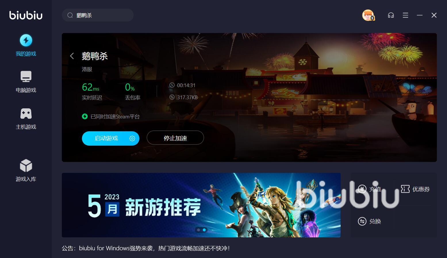以上就是steam玩鵝鴨殺需要加速器嗎,無論你是從什么地方下載的游戲,經(jīng)過網(wǎng)絡(luò)優(yōu)化之后,實際的體驗狀況,都會更上一層樓,如果你沒用過類似產(chǎn)品,不知道該選擇哪一款加速軟件,那么可以嘗試一下biubiu加速器。