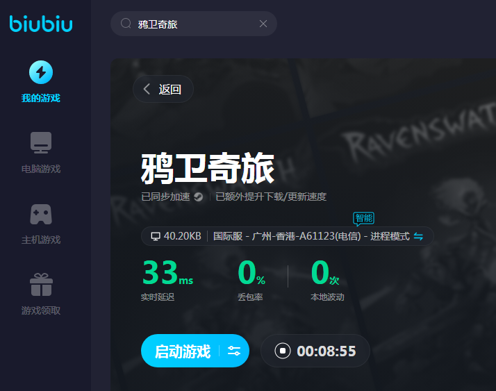接下來大家只要在biubiu里搜索鴉衛(wèi)奇旅,就能看到它有一個(gè)藍(lán)色的按鈕,需要加速的時(shí)候點(diǎn)一下即可。系統(tǒng)將使用智能節(jié)點(diǎn)和進(jìn)程模式來加速,大家也可以在頁面重新調(diào)整節(jié)點(diǎn)或者是模式。成功以后就能享受到絲滑流暢的網(wǎng)速了,速度快得堪比電競賽事般,而且非常穩(wěn)定,從此再也不擔(dān)心玩游戲被閃退了。