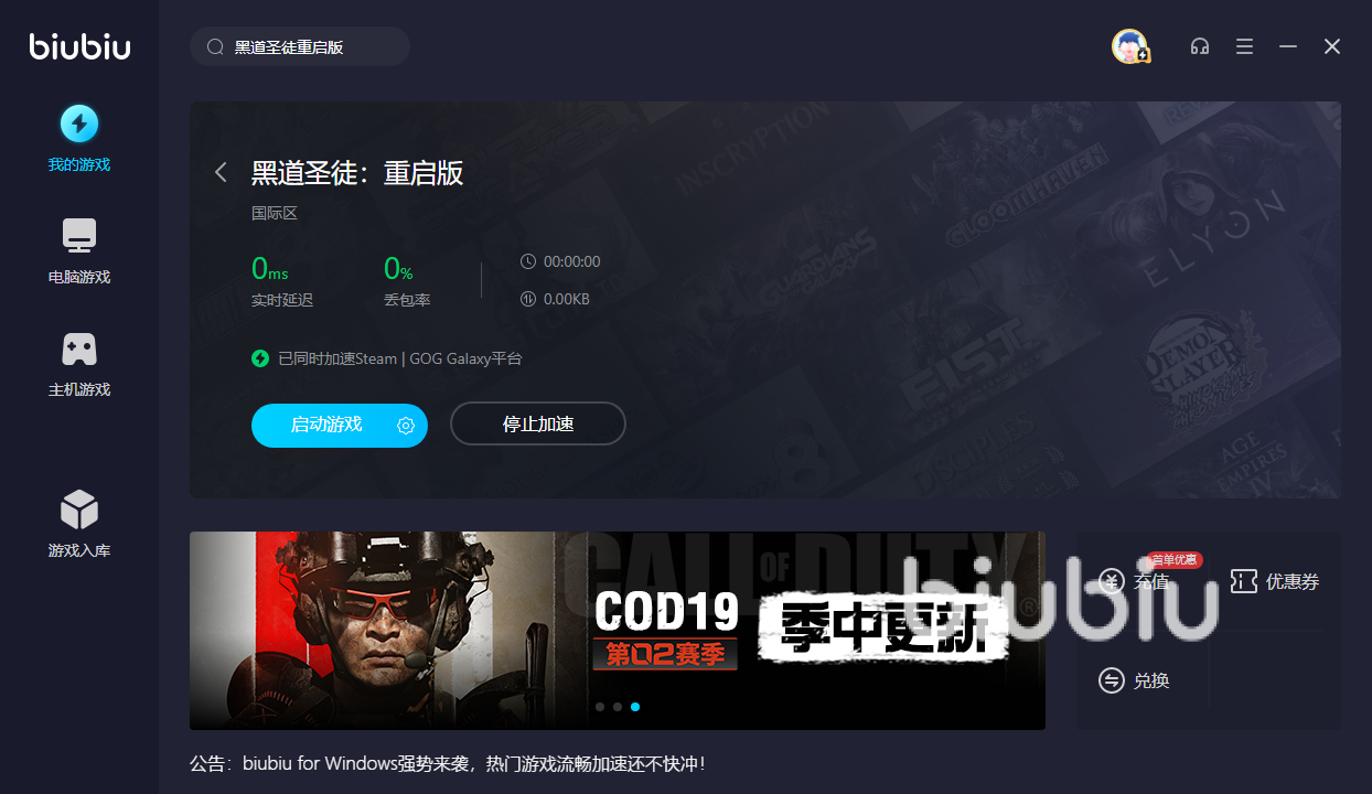 如果有第一次使用biubiu加速器的朋友不太了解具體的用法的話,也不要著急,小編這就來將流程一步一步的介紹給大家。首先通過百度搜索biubiu官網(wǎng)下載或者從上文鏈接下載加速器之后,通過手機號注冊、實名認證兩步之后,就能夠收到一份來自官方的禮物——24小時的全平臺會員體驗,然后通過搜索框輸入黑道圣徒重啟版,點擊立即添加就可以將這款游戲加入到加速庫中,然后點擊一鍵加速就能夠暢享到全程無卡頓的游戲過程啦,是不是非常簡單呢?