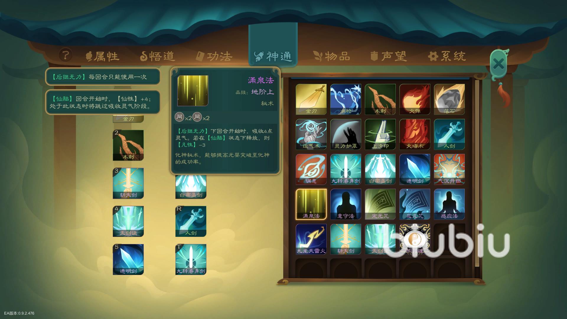 涌泉法可以通過消耗2種不同的靈氣,來讓你在下回合開始時,吸收4點(diǎn)靈氣。若在仙胎狀態(tài)下釋放,則凡性-3,忘凡咒則是只能在仙胎狀態(tài)下釋放,本回合結(jié)束時,若仍處于仙胎狀態(tài),則凡性-4,定元咒可以通過消耗2種不同的靈氣,效果是凡體狀態(tài)下方可使用。下一次進(jìn)入仙胎狀態(tài)時,吸收4點(diǎn)靈氣,意守法的效果是下回合開始時若處于仙胎狀態(tài),則每有仙性*10,吸收一點(diǎn)靈氣。九龍?zhí)炖谆鸬男Ч鞘褂孟嗌撵`氣釋放時,淬體+3;使用相克的靈氣釋放時,塑魂+3。