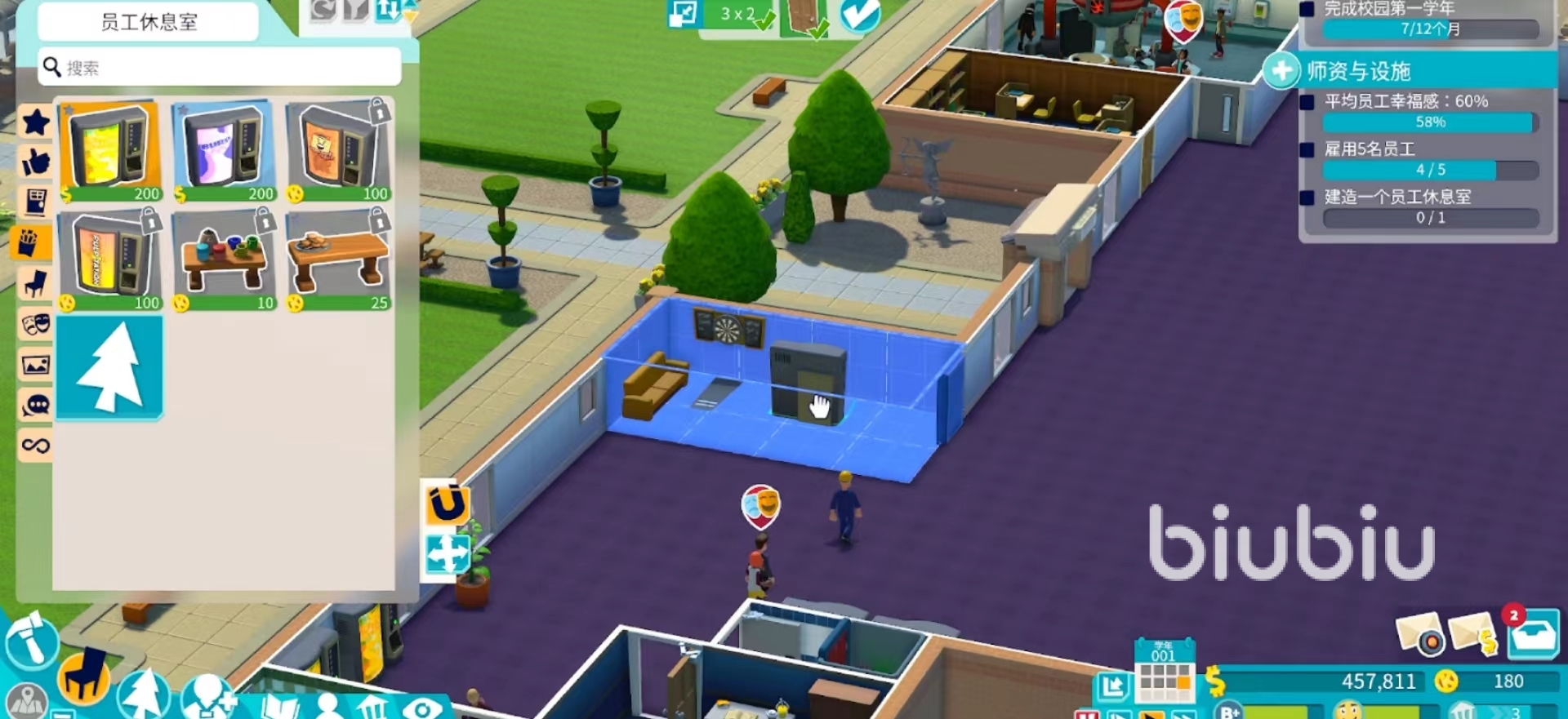 等待第一學年結(jié)束,要是等不及可通過時間控制器,加快第一學年的結(jié)束。玩家想要三星過任務的話,需要滿足員工幸福指數(shù)達到60%、雇傭5名員工、建造員工休息室3個任務。但實際上建造一個員工休息室,再招攬3名員工,有了休息的地方和更多人手分擔工作,員工幸福度會自動提升到60%。