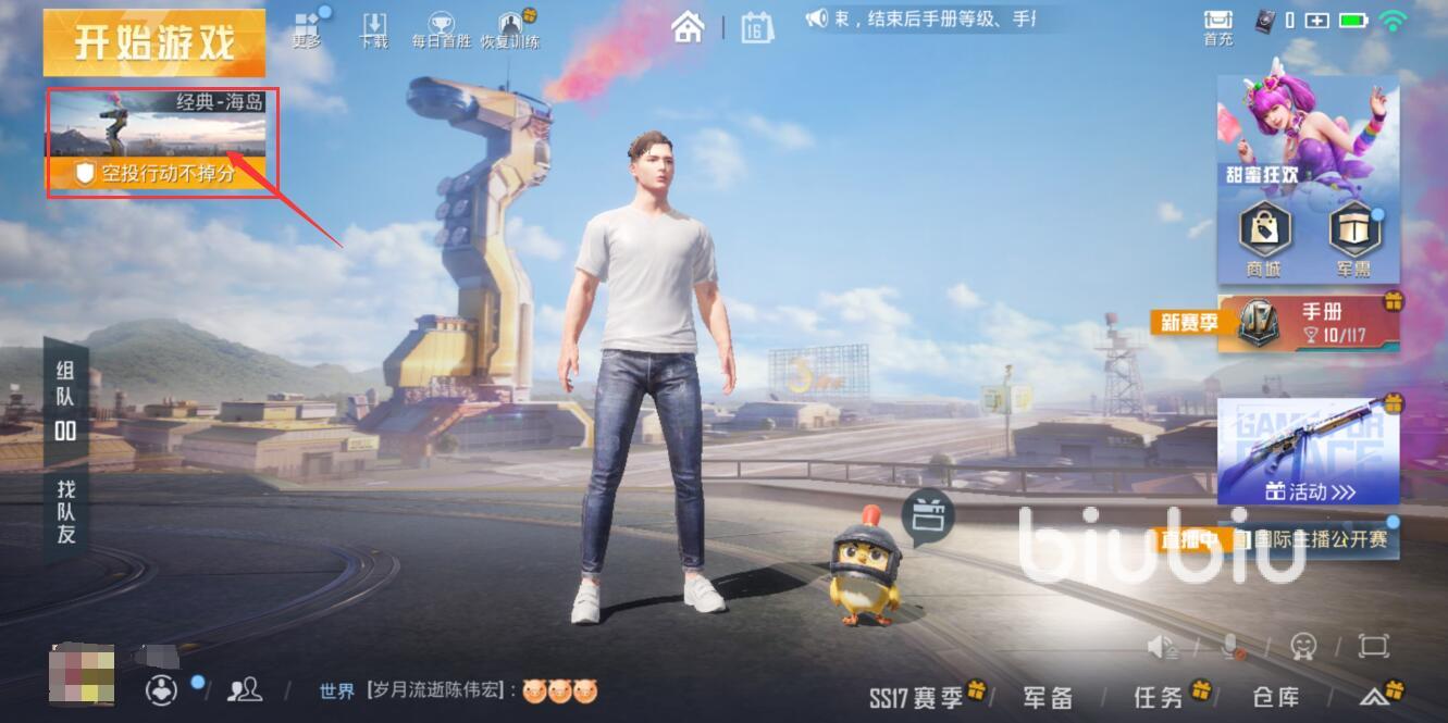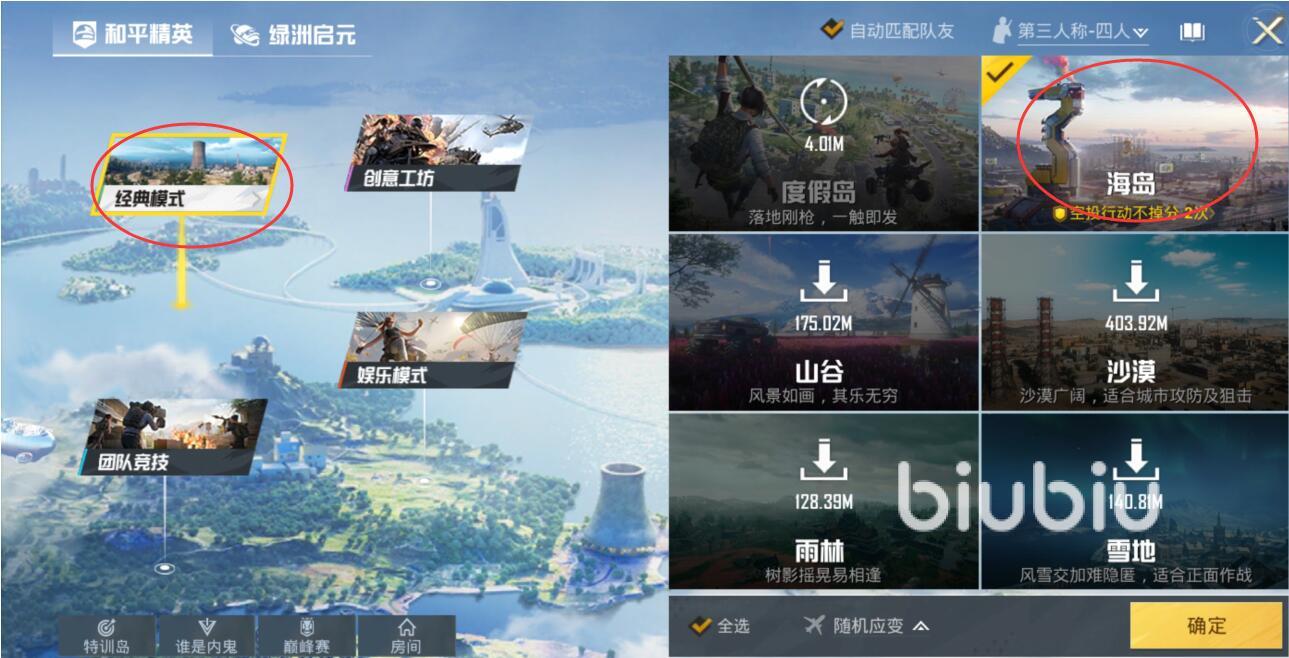 2、選擇經(jīng)典模式,右邊就會跳出來一個【海島】地圖,海島字眼下方會提示“空投行動不掉分2次”,這就是3周年地圖的空投行動模式了。