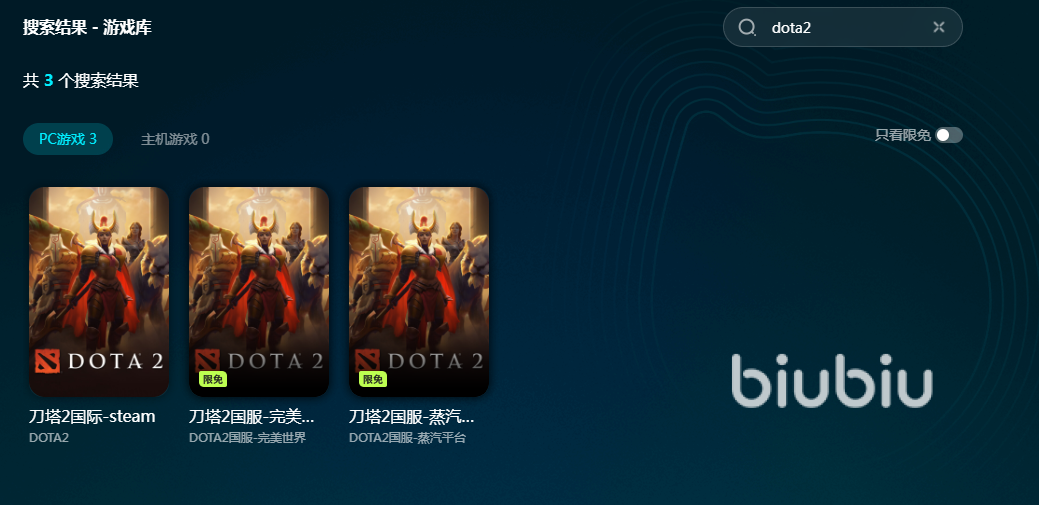 小編非常推薦大家用biubiu加速器,現(xiàn)在正好有免費(fèi)試用的活動(dòng),只要注冊(cè)新用戶就能享受24小時(shí)免費(fèi)體驗(yàn)。biubiu里有dota2國服跟國際服的資源,并且支持steam平臺(tái)、完美平臺(tái)等版本,直接在軟件里搜索到游戲就能立馬來加速。想要延長免費(fèi)加速的小伙伴使用兌換碼【biubiu不卡頓】后也能領(lǐng)到3天免費(fèi)加速,這樣就有更多加速時(shí)長好好體驗(yàn)了。