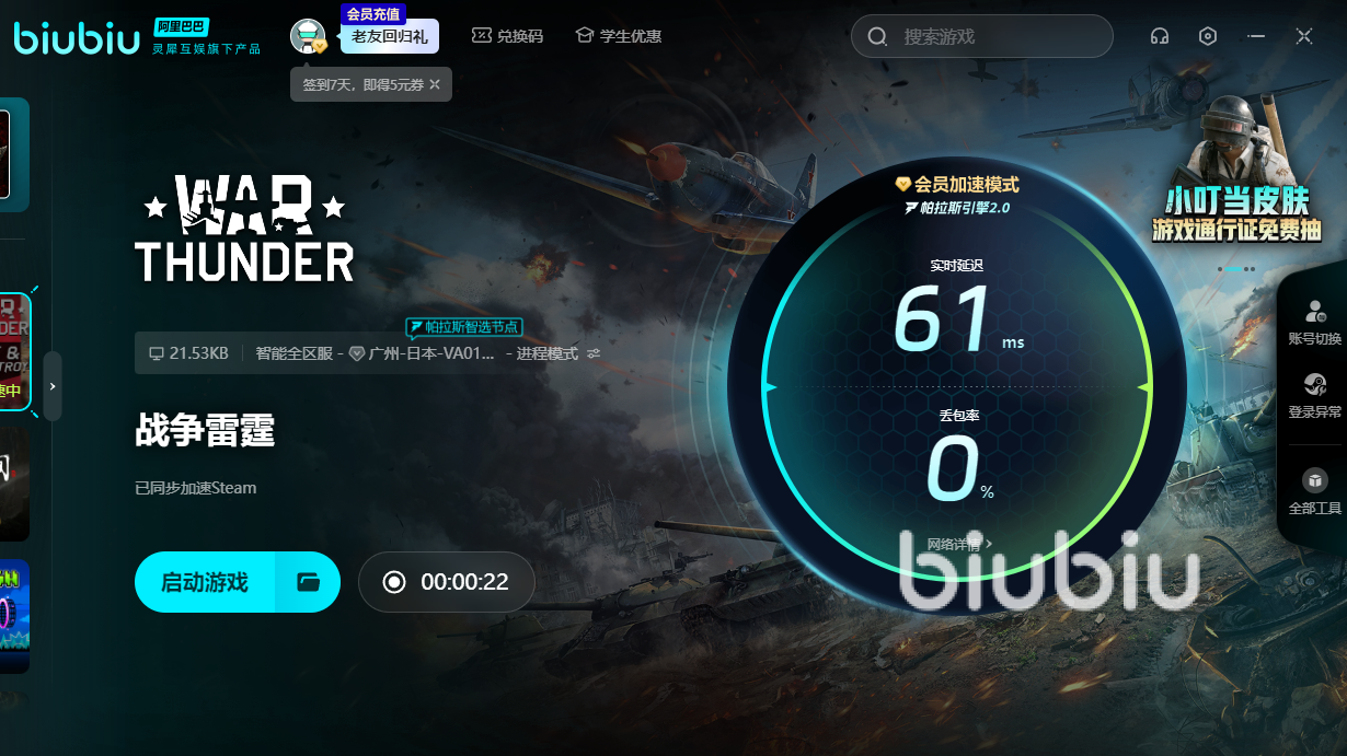戰(zhàn)爭(zhēng)雷霆作為一款全球范圍內(nèi)都知名的國(guó)際大作,如今暫時(shí)沒(méi)有出現(xiàn)國(guó)服。所以我們想體驗(yàn)的話還得借助biubiu,加速后才有機(jī)會(huì)登陸飛機(jī)內(nèi)開(kāi)啟全新的飛行人生!新用戶的話可領(lǐng)取24小時(shí)的免費(fèi)加速,另外新老用戶輸入【biubiu不卡頓】,輕松額外獲得三天免費(fèi)加速。不過(guò)飛行途中一卡的話,就無(wú)法及時(shí)躲避對(duì)方的追擊。用上了加速器后,就能讓你轉(zhuǎn)動(dòng)方向并躲掉對(duì)方的狙擊。