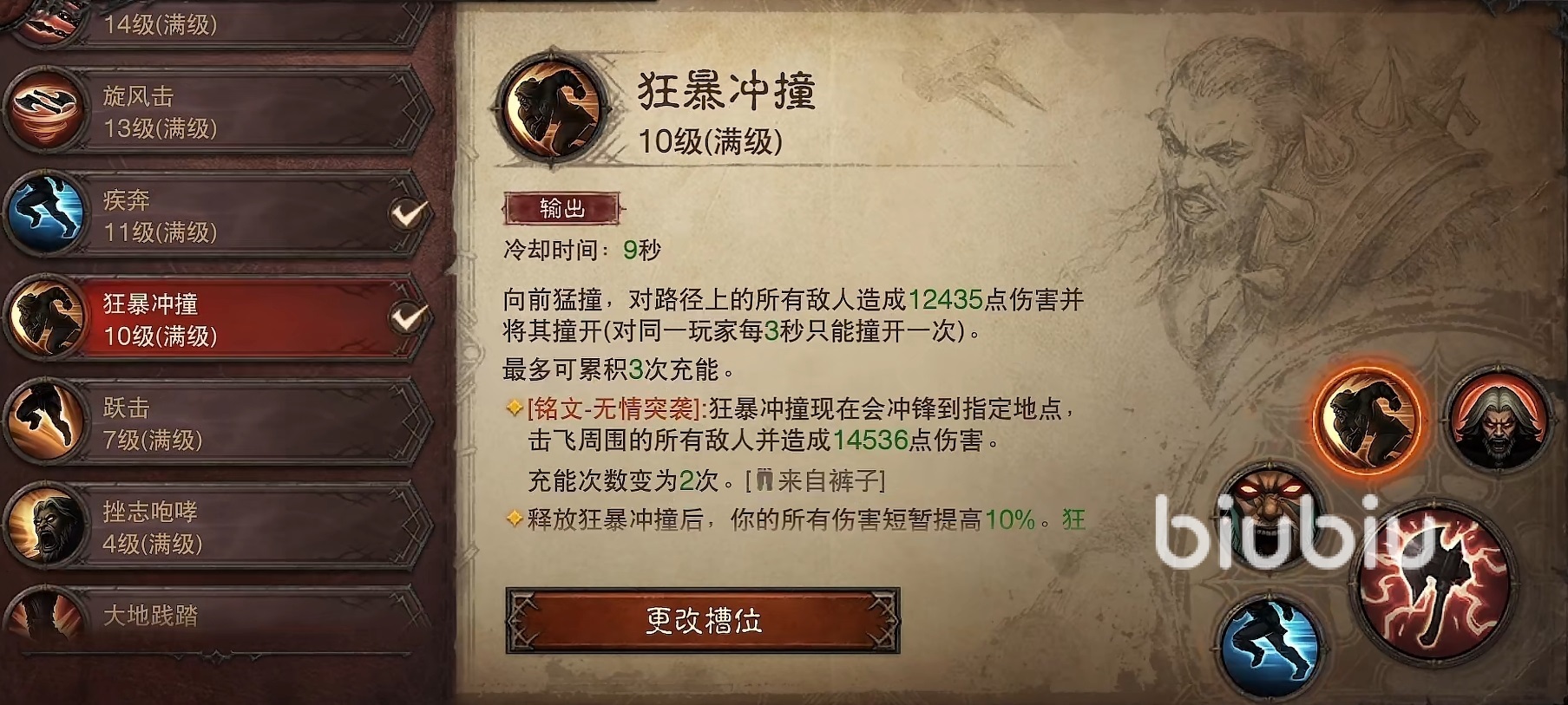 第三個(gè)技能選擇狂暴沖撞,可以朝著前方猛烈沖撞,能夠累積三次充能,是野蠻人重要的位移和控制技能,銘文選擇無情突襲,效果變?yōu)槌付ǚ较驔_鋒并且擊飛和擊傷敵人。最后一個(gè)技能選擇不滅之怒,在技能持續(xù)時(shí)間內(nèi)野蠻人受到傷害不會(huì)死亡,而是維持一點(diǎn)生命值,并且獲得高額的吸血效果。此技能堪稱是野蠻人PK時(shí)保命神技,經(jīng)常能創(chuàng)造奇跡。