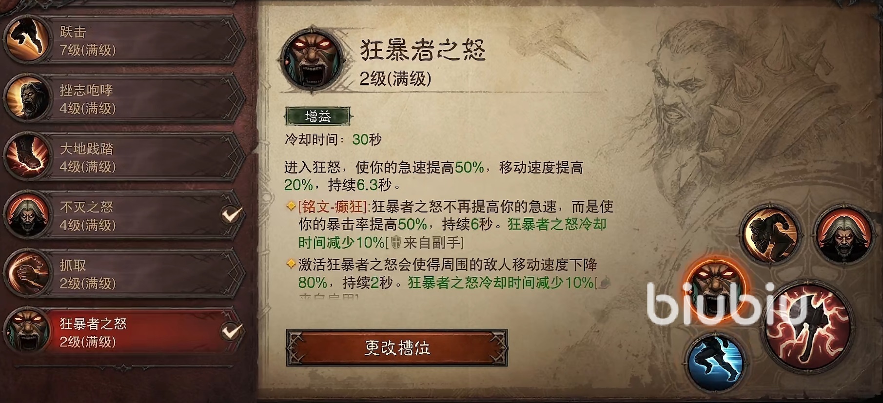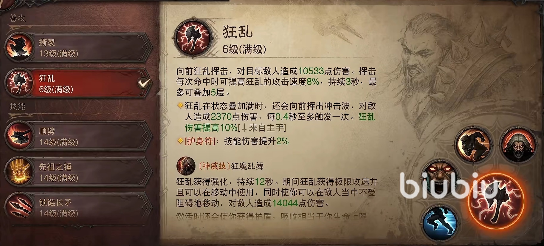 在各種套裝和狀態(tài)的加持下,疾奔的加速效果能夠做到全覆蓋,這樣敵人想要拉開距離也是非常困難。這樣最困擾野蠻人的放風(fēng)箏就被攻克了。最后再分享一個(gè)小技巧,就是不滅之怒不用等它被動(dòng)觸發(fā),可以提前使用,就是為了獲得吸血效果,很多時(shí)候能夠有奇效。