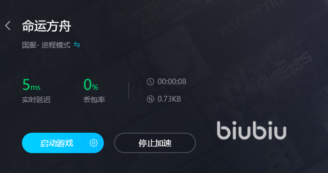 從biubiu上就能打開游戲一鍵啟動,很多玩家都會誤認為有了加速器之后是要多操作幾個步驟,其實并不是的,加速器安裝好了之后會把啟動游戲的按鈕連通到biubiu上面,玩家直接在上面就能啟動游戲,這樣的話就可以直接用加速器了。除了方便以外,圖中玩家也能看到整個命運方舟游戲的延遲是很低的,并且沒有丟包情況,所以整個游戲的狀態(tài)很好,非常適合玩家體驗。