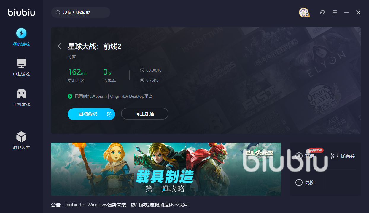 下載biubiu加速器的方式簡單,只要到官網(wǎng)或是現(xiàn)在點擊上面的“傳送門”就能去下載,下載之后完成簡單的實名認證和手機號綁定即可享受加速服務,就像今天講到的星球大戰(zhàn)前線2這款游戲,想要玩它就直接在最上方的搜索框里面輸入游戲的名字即可,并且其他所有的游戲都是通過這個方法來進行搜索,雖然不能確保你玩的游戲一定會有,但它收納的游戲眾多,是有很大概率能夠找到的。