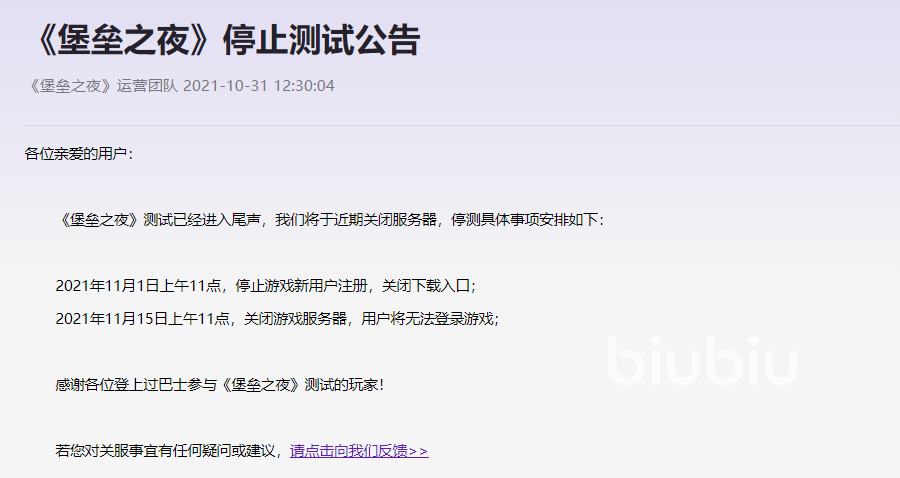首先需要說明的是,堡壘之夜初步停服將在2021年10月1號上午11點。在11月11號之后堡壘之夜就會停止新用戶。注冊并且會關(guān)閉下載入口。然后在2021年11月15日的上午11點,堡壘之夜會正式關(guān)閉游戲的服務器,屆時所有的游戲玩家將都無法登錄游戲。