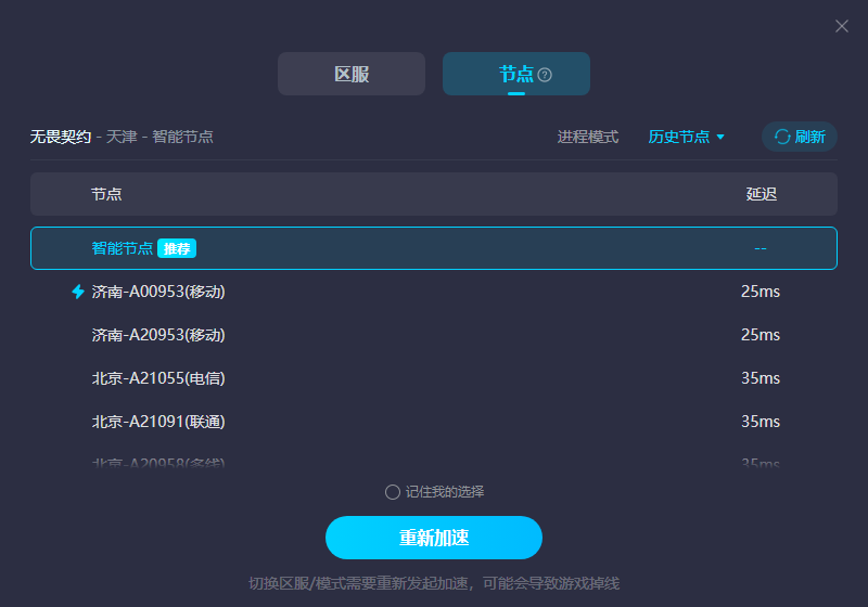 Biubiu加速器還有一個功能非常適用于無畏契約這款游戲,因為無畏契約的每一場對局都是會切換不同的地區(qū)服務(wù)器,其中有南京、天津、廣州等城市地區(qū),如果你沒有選擇鎖定某一個地區(qū)的話,就可以在開始之前先看一下加載的是哪一個地區(qū)服務(wù)器,然后再從biubiu加速器內(nèi)選擇對應(yīng)的節(jié)點(diǎn)就好了,這也就是能實(shí)現(xiàn)個位數(shù)延遲的一個秘訣,如果加速不對應(yīng)的話,反倒可能會起到副作用。